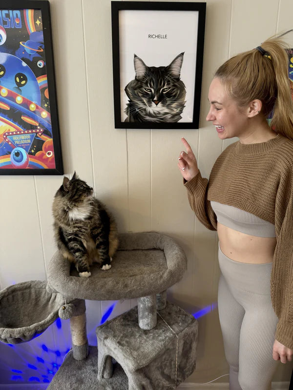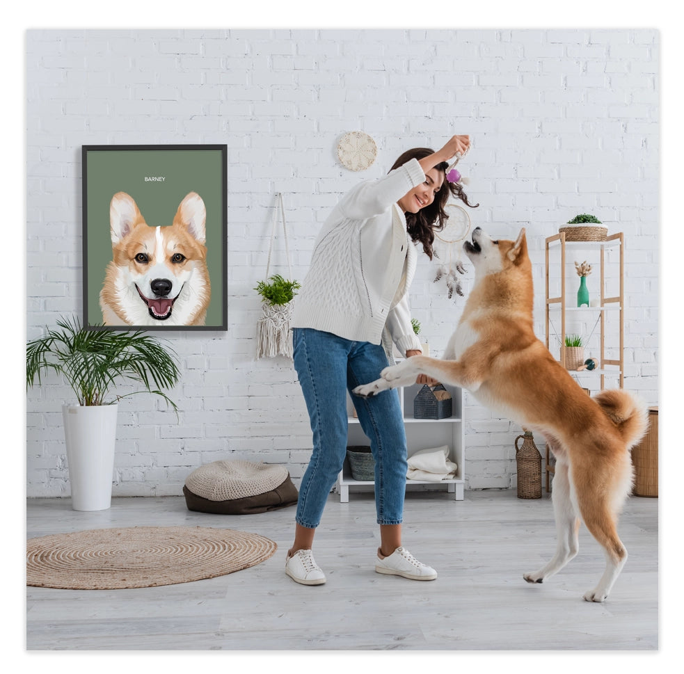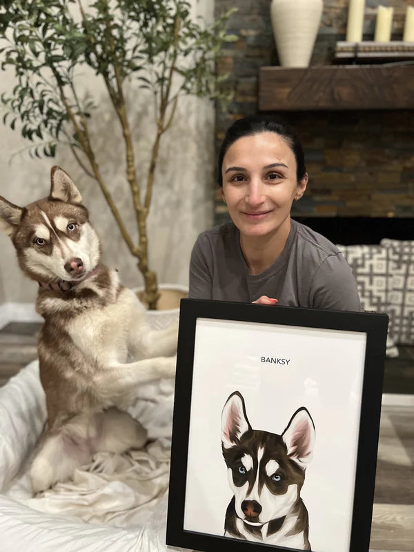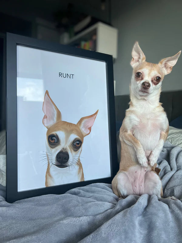 Select size, frame, background color, and upload your pet's photo. A clear photo with good lighting is ideal!